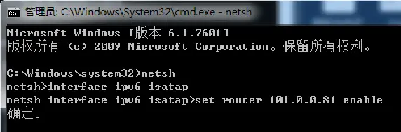 实验用的客户端使用windows 7,原生支持ISATAP隧道,如上图,需要进入netsh开启并且设置ISATAP的路由器地址(支持域名)。
