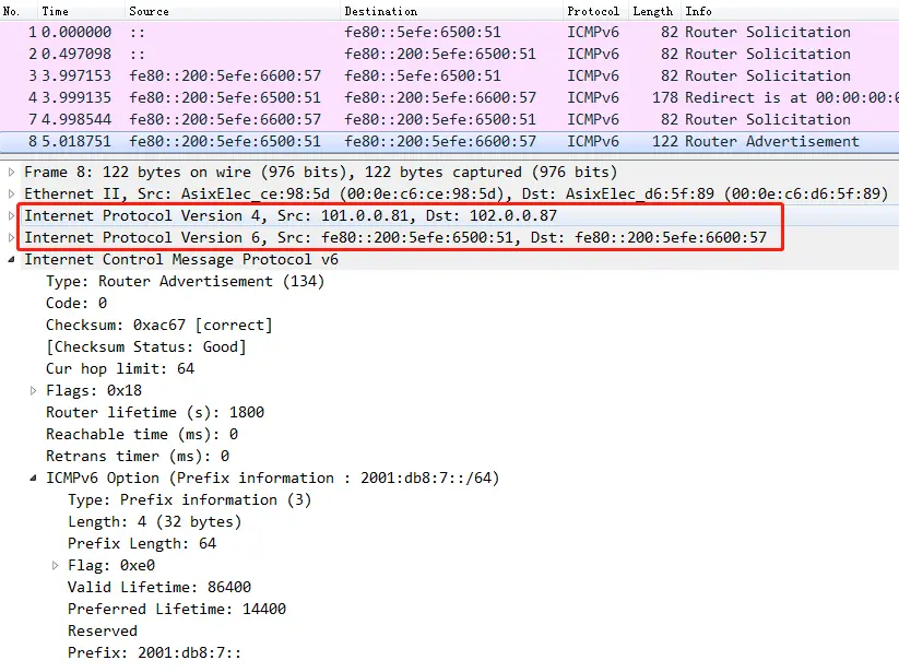 当客户端设置完router后,隧道已经建立,客户端便发起了无状态自动配置流程,可以看到上面的截图路由器通过隧道将前缀信息下发给客户端,客户端完成无状态自动配置,获取到公网IP地址。