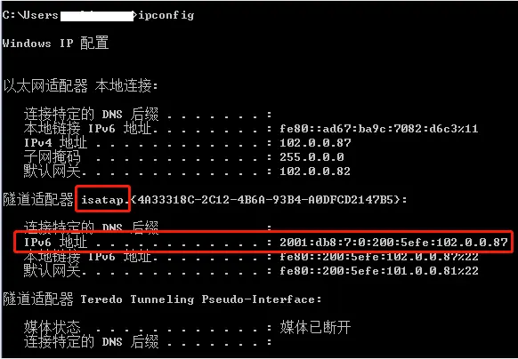 在windows 7上查看ISATAP接口,获取到公网地址。这个地址类型是ISATAP专用的地址结构,由64位全球单播路由前缀:200(0):5e5f:w.x.y.z组成(w.x.y.z是客户端的IPv4地址)。