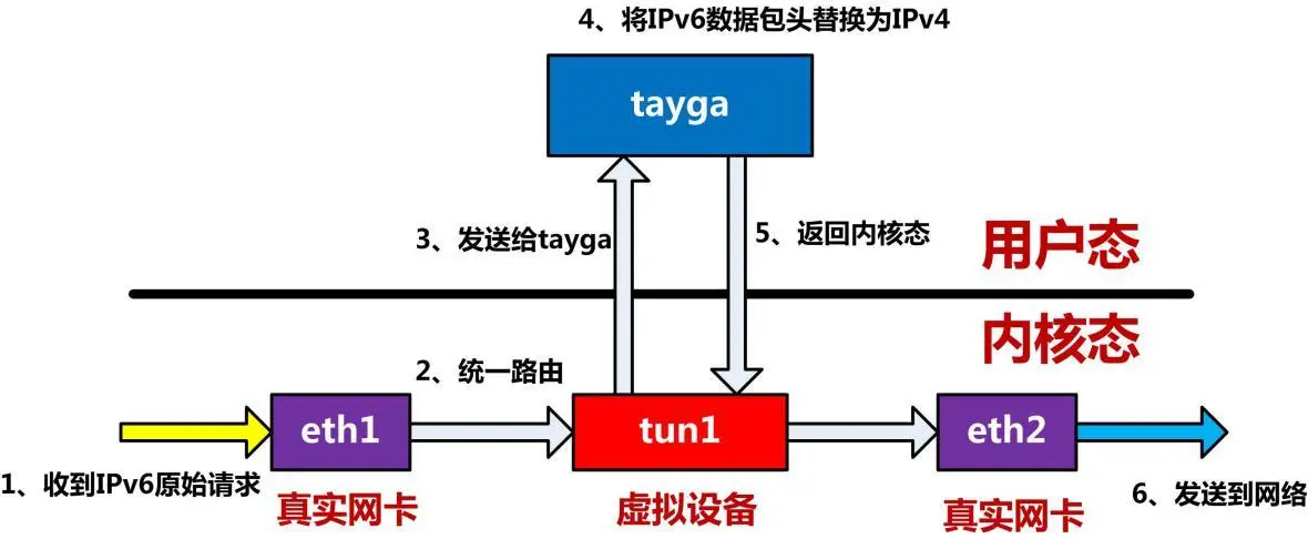 Linux内核自带了一个软件虚拟设备,也是一种隧道的实现(/dev/net/tun),该设备可以实现将内核态的网络数据发送到用户态,用户态修改后再返回给内核态,用户态的进程负责完成NAT64这一次“偷龙转凤”操作。