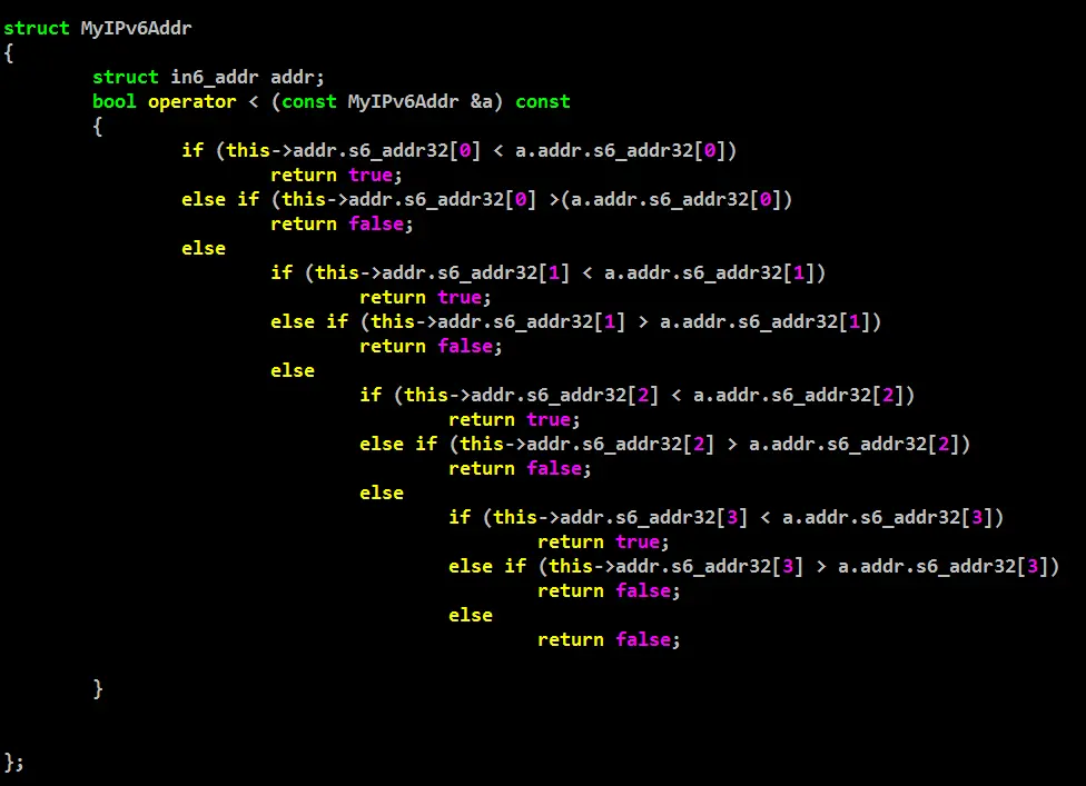 其实还有更优雅的方式,直接将IPv6的地址强制转为2个64位整数来比较,if else会写得更少一些,效率更高一些。