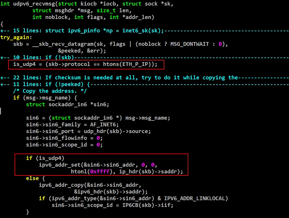 可以看到的是,IPv6的socket会正常收到客户端的数据报文,并且会将IPv4地址转化为映射地址,为了明确这个逻辑,我们分析Linux内核的实现。