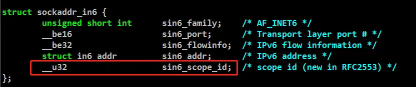 因此IPv6引入了scope_id来解决这个问题,scope_id指定了使用哪个网络接口。
