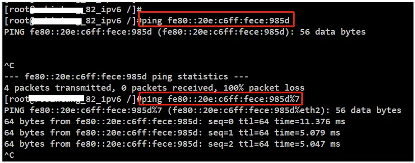 而在使用ping命令的时候,需要在地址后面加上%和scope_id才能ping成功,如图: