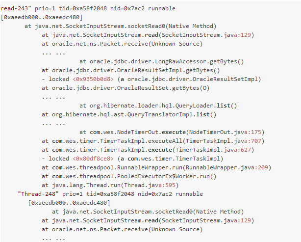 从堆栈看,有 51 个(socket)访问,其中有 50 个是 JDBC 数据库访问。其他方法被阻塞在 java.lang.Object.wait() 方法上。