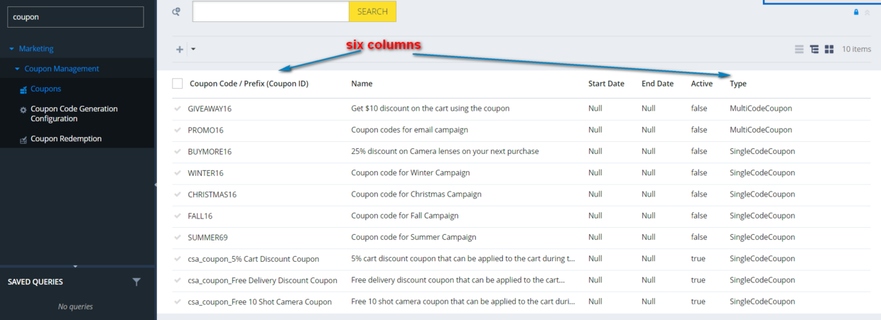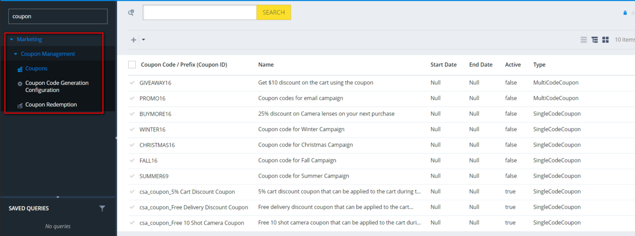 比如我通过backoffice左边倒L形的工作中心列表查看优惠券列表,这个列表实际上是一棵树,根节点是Marketing。