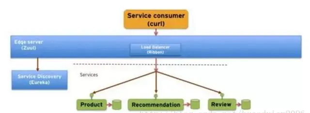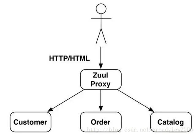 那么Spring Cloud是如何解决服务的负载均衡问题的呢?由于Spring Cloud的微服务接口主要是基于REST协议实现的,因此它采用了传统的HTTP Proxy机制。如下图所示,Zuul类似一个Nginx的服务网关,所有客户端请求都通过这个网关来访问后台的服务。