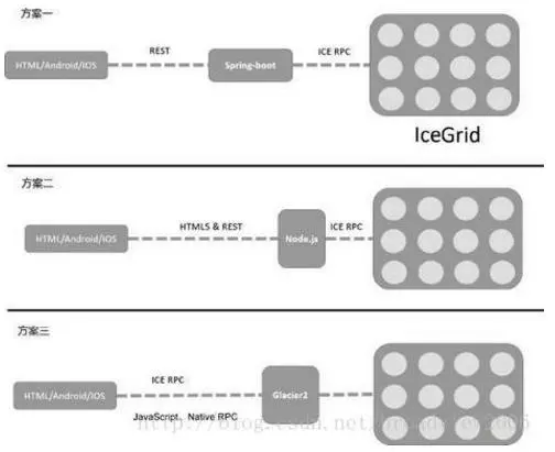 如果基于IceGrid开发系统,则通常有三种典型的技术方案,如下图所示。