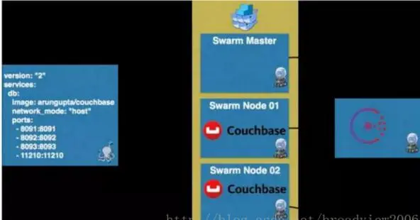 上图中的Docker Compose是官方编排(Orchestration)项目,它提供了一个YAML格式的文件,用于描述一个容器化的分布式应用,并且提供了相应的工具来实现一键部署的功能。下图给出了两节点的Couchbase集群对应的YAML文件定义,此Couchbase集群随后被部署到了Swarm集群中的两个Node节点上。