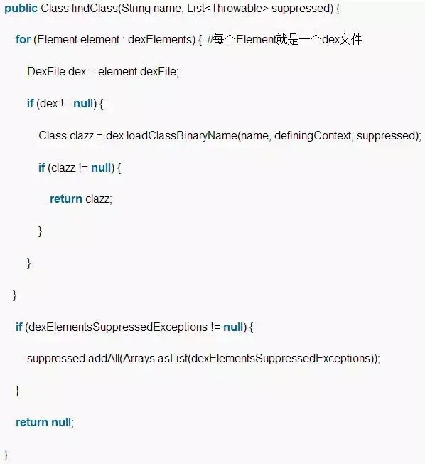 一个ClassLoader可以包含多个dex文件,每个dex文件是一个Element,多个dex文件排列成一个有序的数组dexElements,当找类的时候,会按顺序遍历dex文件,然后从当前遍历的dex文件中找类,如果找类则返回,如果找不到从下一个dex文件继续查找。
