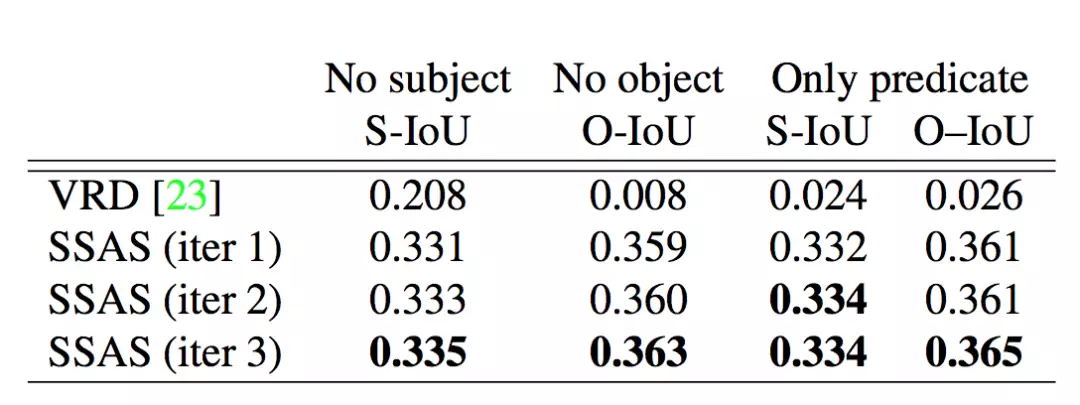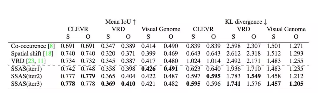 以下是我们在 CLEVR、VRD 和 Visual Genome 上的评估结果。 我们分别标出了对主题和对象定位的 Mean IoU 和 KL 分歧: