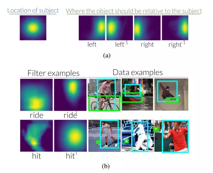 图 3:(a)相对于图像中的主体,当使用<subject - left - of object>关系来查找客体时,左边的谓语会把注意力转移到右边。相反,当使用物体找到主体时,左侧的逆谓语会将注意力转移到左侧。在辅助材料中,我们可视化了 70 个 VRD、6 个 CLEVR 和 70 个 Visual Genome 的谓语和逆谓语转化(b)我们还看到,在查看用于了解它们的数据集时,这些转换是直观的。