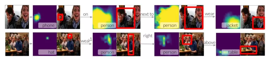 我们设计了一个迭代模型,学习如何在视觉关系中使用谓语来操作注意力转移,这受到了心理学中移动聚光理论的启发。给出足球的初始估值后,它会学习踢球的人必须在哪里。同样,如果对人进行估值,它将会学习确定球的位置。通过在这些估值之间进行迭代,我们的模型能够专注于正确实例,并排除其它实例。