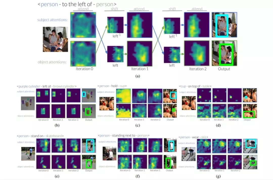 图 4:这是 CLEVR 和 Visual Genome 数据集的注意力转移如何跨越多次迭代的示例。在第一次迭代时,模型仅接收试图找到以及尝试定位这些类别中所有实例的实体信息。在后面的迭代中,我们看到谓语转换注意力,这可以让我们的模型消除相同类别的不同实例之间的歧义。