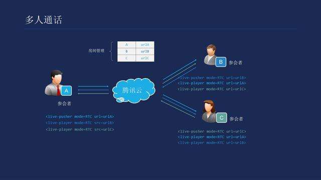 其实多人解决方案里面服务端要多做一些事情,还需要一个类似于房间管理的概念,把A、B、C三个人拉里面,进行状态同步。我们其实在小程序里面没有内置这么多的东西,其实有一点是说微信以简单为主,不要搞的那么复杂。所以就提了一个rtcroom解决方案,就是附及一些额外的逻辑,这一块在腾讯云移动直播解决方案里面是可以找到相应的东西的,或者在小程序音视频里面也可以找到相应的资料。