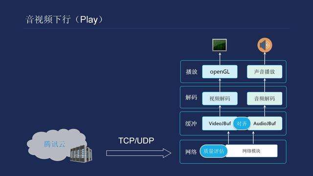 然后下行,俗称拉流。原来上去的,现在下来,这个就叫播放。播放的话,其实就是从上至下,尤其是网速时快时慢时候,你会发现播放一卡一卡的,这种效果优化就不好,所以一定要加一个缓存,像一个蓄水池一样,合适的时候在优化,再进行解码,进行渲染。