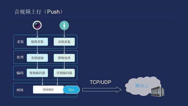 上行解决什么问题?上行叫推流,就是把本地的画面经过采集然后进行预处理,有人可能问处理要干什么?比如说美颜,这个很接地气的需求。再有要降噪,声音也需要降噪,可能音频其他背景很不好的情况下,听着也很不舒服了。然后再进行编码,我们需要以数量级十倍、二十倍把这个数据量压下去。再最后通过网络模块传到云端上去,现在基本上音视频研发都是依赖于这个的,但是效果和稳定性都比较查,不过现在网络成本已经开始降下来了,所以没必要再这样做了,现在直接就可以使用腾讯云。