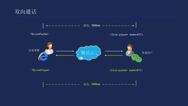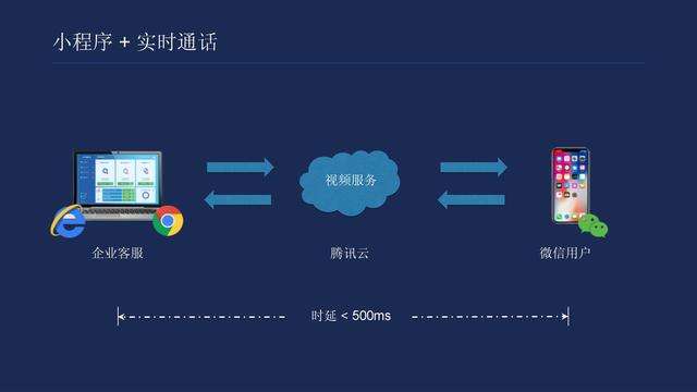 说一下双面音视频,如果两个人聊就是两个朋友或者关系很好的人,这叫交友。但是如果放在企业里面,放在客服系统上这就完全不一样了,比如在线的客服系统,就有很大的优势,相比于传统的一些电话系统。我们可以看这样一个场景,早晨开车上班,迟到了老板没有等到回报,很着急。这时候车擦了,你等着定审的人过来,堵塞交通一两千就罚掉了。这个时候特别希望在线视频就可以解决。我们有很多客户尝试使用APP解决相关问题。但是很多用户抵触心理很强。如果这个时候你跟他说点个链接,在小程序里面搜一个什么什么保险,就可以完成这个简单的流程,后续接入视频通话,在这里拍一个照,然后那边定损人员一看你权责,他权责,这样保险公司和用户都很喜欢。