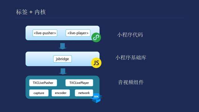 首先技术架构就不说了,说说我们在微信里面内嵌了音视频组件吧,它是一个免费使用的版本,这个产品我们已经打磨了已经有两年多了,而且现在每个月都一两次更新。而且这里面SDK有两部分组成的,一个是音视频上行,另一个是音视频下行。