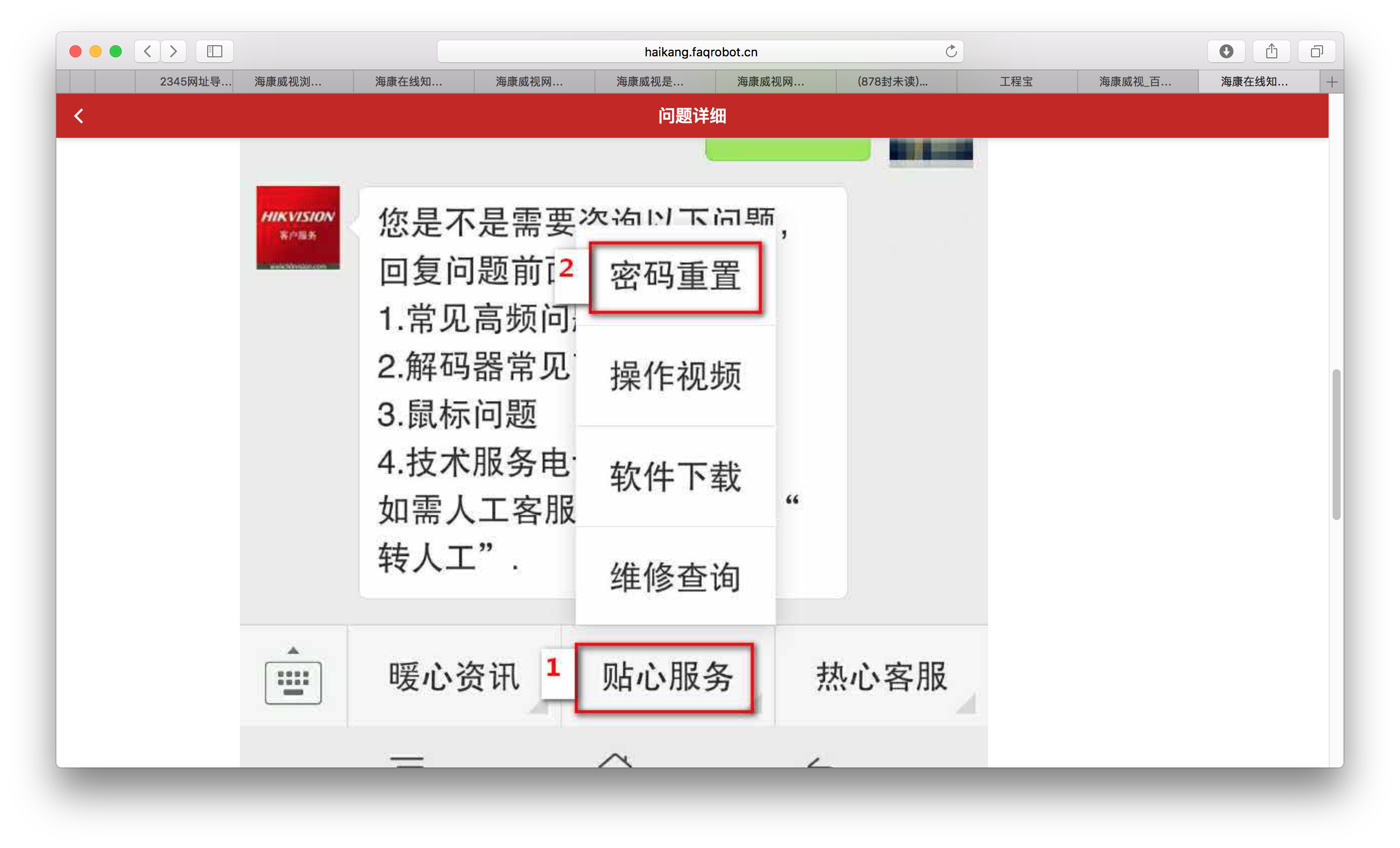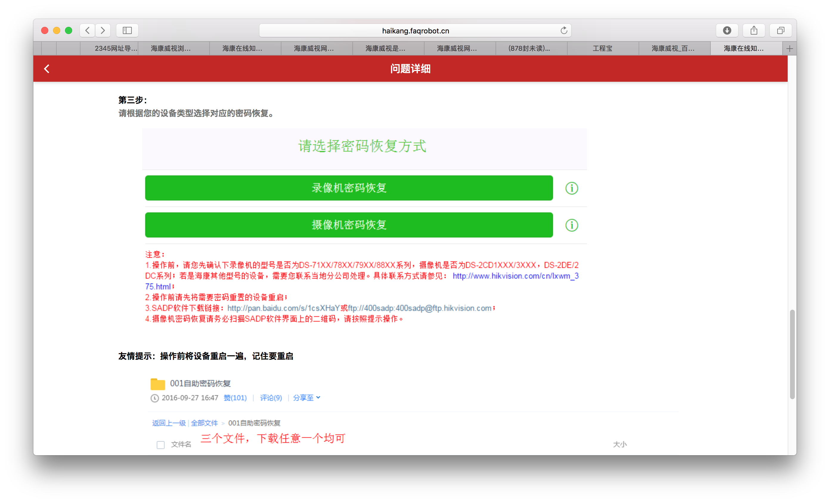 单个恢复密码步骤 第一步: 关注“海康威视客户服务”微信公众号,选择 “贴心服务”-“密码服务”,填写信息。 第二步: 用电脑下载设备网络搜索软件(SADP)下载地址,这个可以批量重置,和官网下载的那个不一样。如果已经下载了官网版本,先退出SADP,安装过程中会把官网版本自动卸载掉,完成安装。
