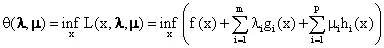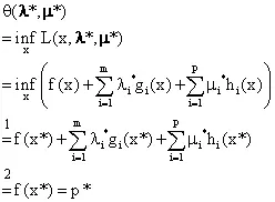 如果我们把拉格朗日函数看做是x的函数,然后取下确界(注意:是在整个定义域里取下确界,而不是仅仅在可行域里取值,也就是说取下确界时对x是没有约束的),那么得到的结果就是原优化问题(1)的最优值的一个下界。