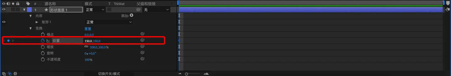 首先, 选中我们的图层, 点击图层左侧三角, 展开变换选项, 选中位置属性, 同时把时间轴移动到0: