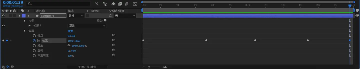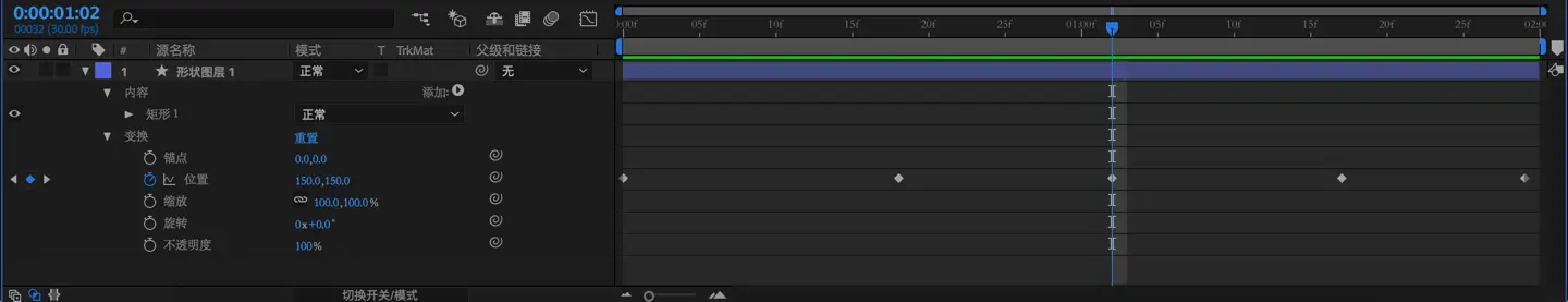 现在我们需要给其添加关键帧让其动起来。 AE 里的关键帧跟 CSS 里的 keyframe 属性没有什么区别, 我们只需要对其运动过程中的某一些节点添加关键属性, 这个元素将会在相邻两个关键帧之间进行关键属性的平滑变换。
