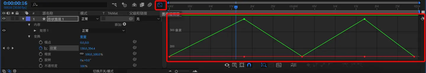 首先, 点击图层区域中位置属性左侧的小时钟图标, 开始记录关键帧, 如图: