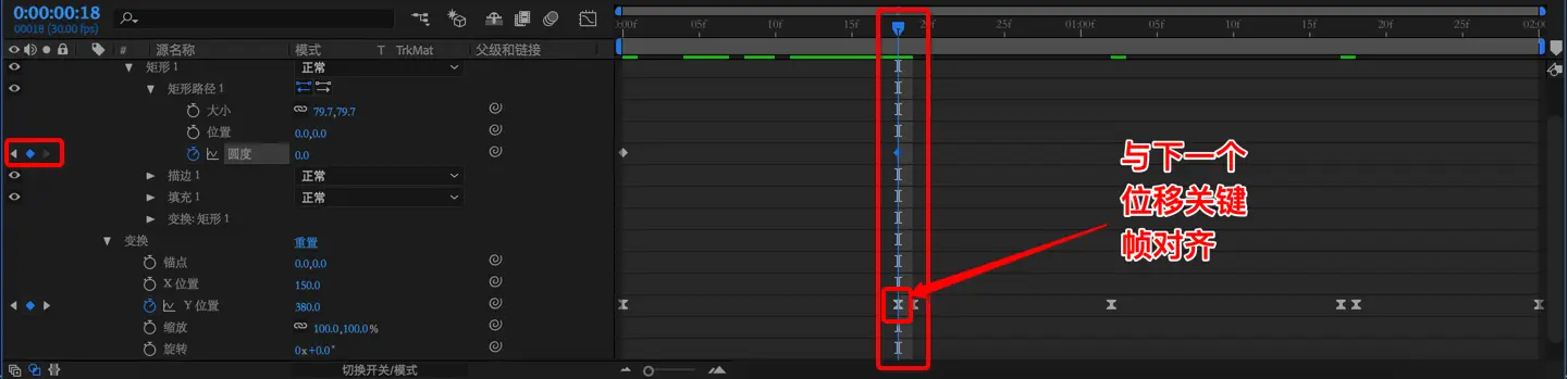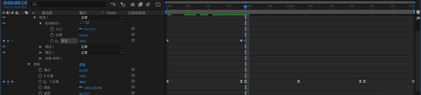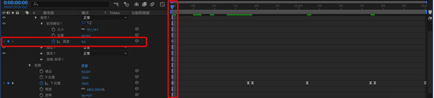 首先, 点击图层左侧三角, 展开变换选项, 依次展开: 内容、矩形、矩形路径。将时间轴移到0, 圆度属性设置为0, 点击圆度左侧的时钟小图标, 开始纪录该属性关键帧。