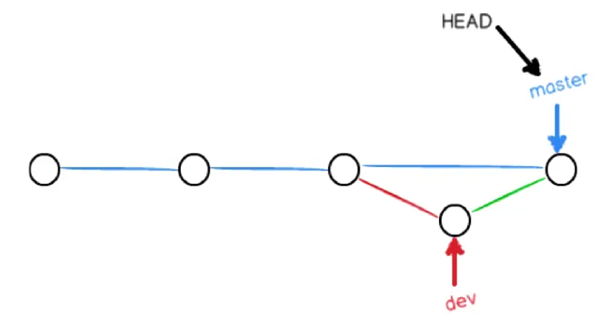 --no-ff即可,git merge --no-ff dev,那非快进模式的好处是什么呢,其实就是如同下图所示,非快进模式可以帮我们保留分支的样子,在树状结构中可以完整的看出分支的情况
