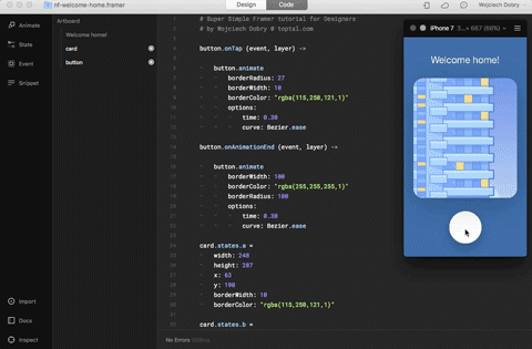 Framer 是一个基于 Javascript 的原型工具,能快速导入 Photoshop、Sketch 中的图像并模拟图层分层,支持手势,动画精细度高,可在手机或平板中预览效果。缺点是需要有一定的编程基础,上手难度较高。