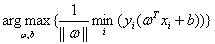 (写到这里我在想一个问题,如何能保证按照这个优化目标找出来的超平面它正好到正样本集和负样本集的间隔是一样的。经过思考后发现,这个已经被包含在了这个优化目标内部。可以这么解释:因为其实我觉得我们可以把平面优化分为ω的最优化和b的最优化,对于相同的ω,不同的b的平面都是平行的。当ω固定时,这时一个正样本到这个平面的距离和一个负样本到这个平面的距离之和的最小值也固定了!后面补图说明。