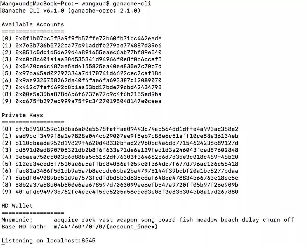 安装完毕后在控制台输入 ganache-cli命令,可以看到以下结果