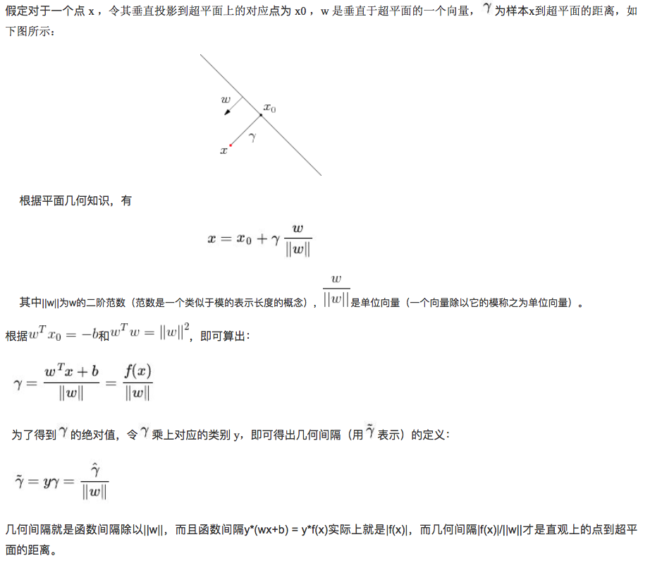 函数间隔可以表示分类预测的正确性及确信度,但选择分离超平面时,只有函数间隔还不够,因为只要成比例改变w和b,超平面并没有改变,但函数间隔却变了,因此需要对分离超平面的法向量加上某些约束,如规范化,||w||=1,使用间隔是确定的,这时函数间隔成为了几何间隔。