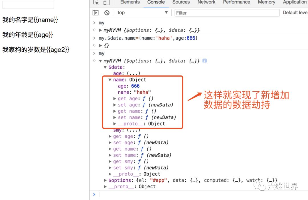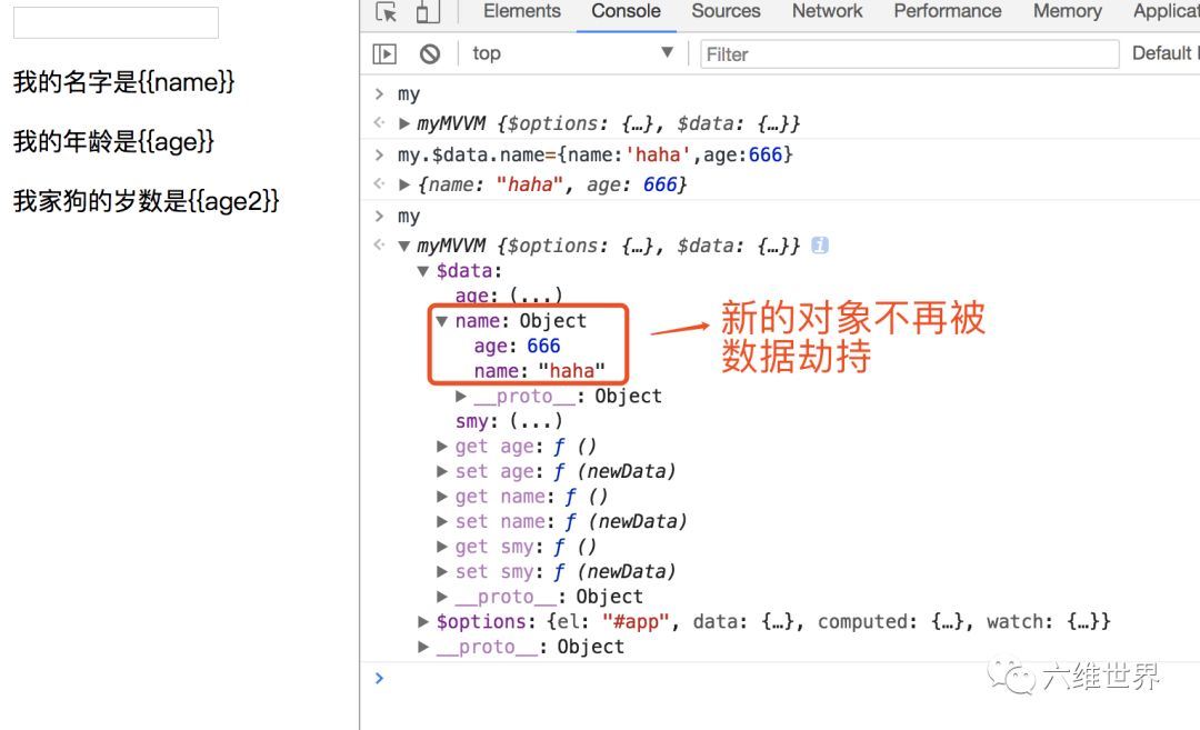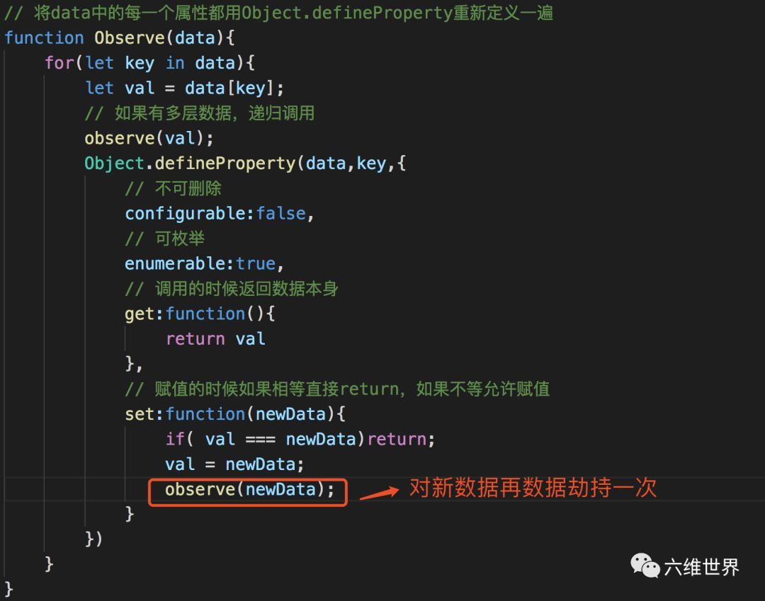 比如我们为name赋值,会走get方法,但是如果我们改变name的值为一个对象,name就会变为这个对象,同时get和set并不存在,所以我们必须也要为新改变的数据进行数据劫持