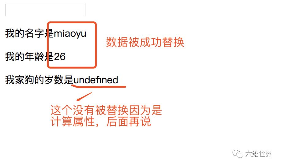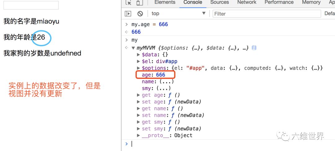 这个时候我们可以看到数据被正确编译,但是当我们更改这个数据的时候,实例上的数据改变了,但是模板上的数据并没有跟着更新,所以接下来我们要实现数据的刷新