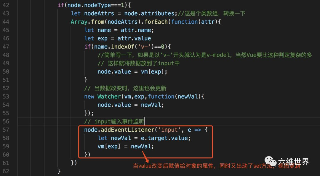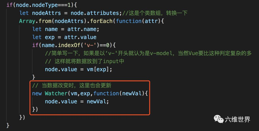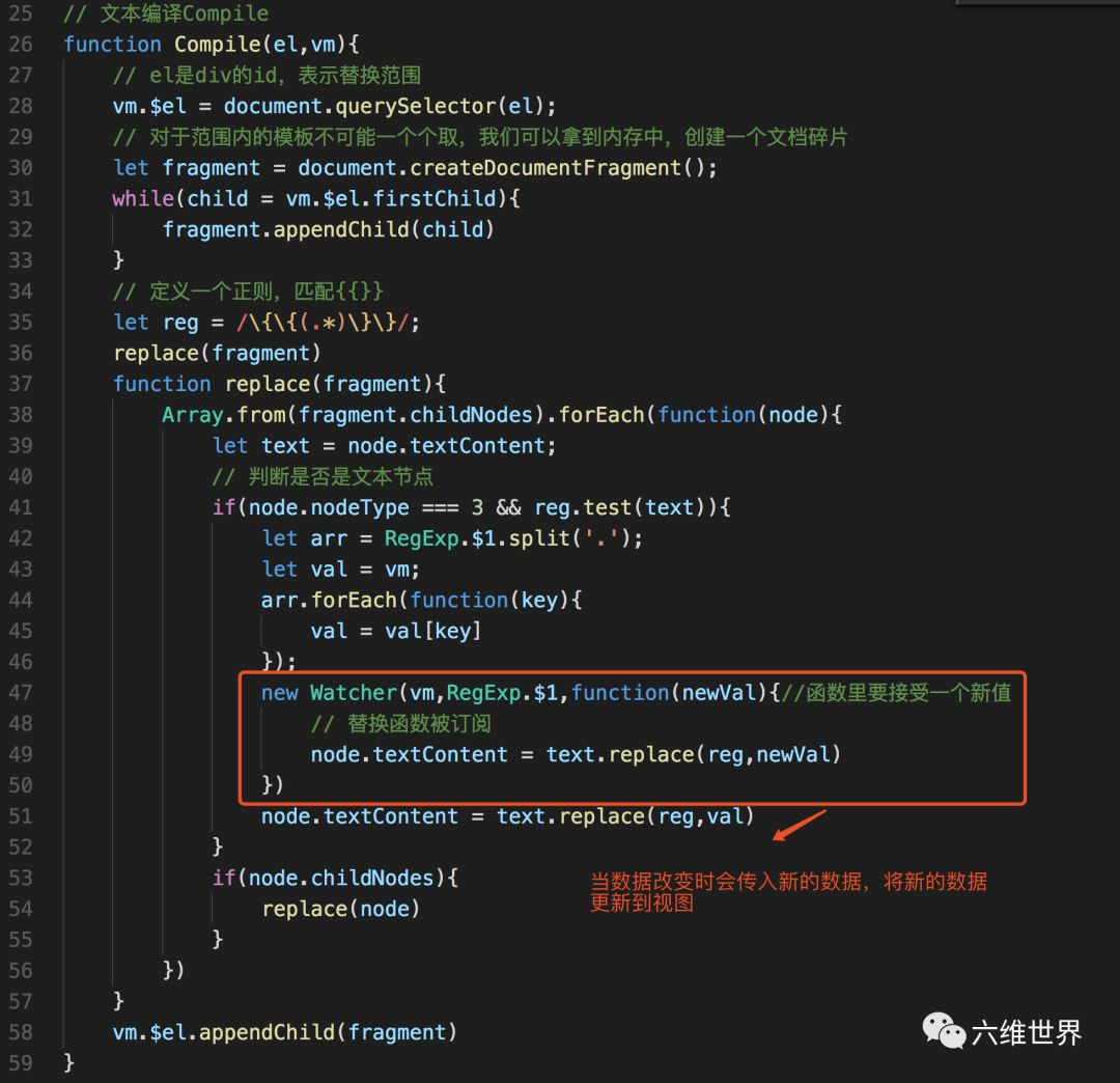 发布订阅模式在我们更新视图时候的应用,当为数据赋值时,将调用notify方法,让被监控的对象执行,而被监控的应该就是Compile内的模板编译的方法,所以我们要将它Watcher一下