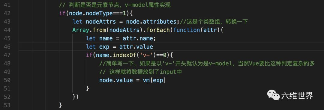 接下来我们将实现这样的双向数据绑定的功能,首先我们要先将name的数据赋值到input的value中,这同样要用到我们的模板编译的方法,之前编译{{}}的时候判定的文本节点,而v-model需要判定的是元素节点