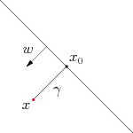 假定对于一个点 x ,令其垂直投影到超平面上的对应点为 x0 ,w 是垂直于超平面的一个向量,为样本x到超平面的距离,如下图所示: