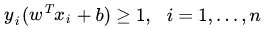 而超平面(w,b)关于T中所有样本点(xi,yi)的函数间隔最小值(其中,x是特征,y是结果标签,i表示第i个样本),便为超平面(w, b)关于训练数据集T的函数间隔: