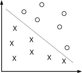 下面举个简单的例子,如下图所示,现在有一个二维平面,平面上有两种不同的数据,分别用圈和叉表示。由于这些数据是线性可分的,所以可以用一条直线将这两类数据分开,这条直线就相当于一个超平面,超平面一边的数据点所对应的y全是 -1 ,另一边所对应的y全是1。