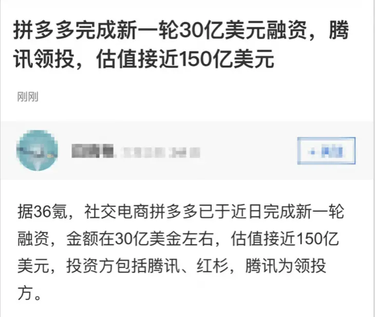 从36氪获悉,社交电商拼多多已于近日完成新一轮融资,金额在30亿美金左右,估值接近150亿美金,投资方包括腾讯、红杉,腾讯为领投方。