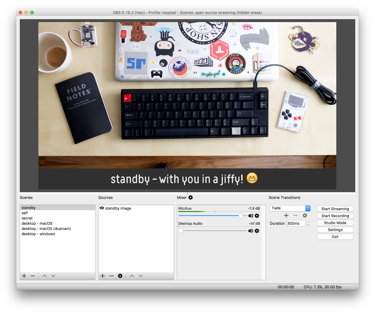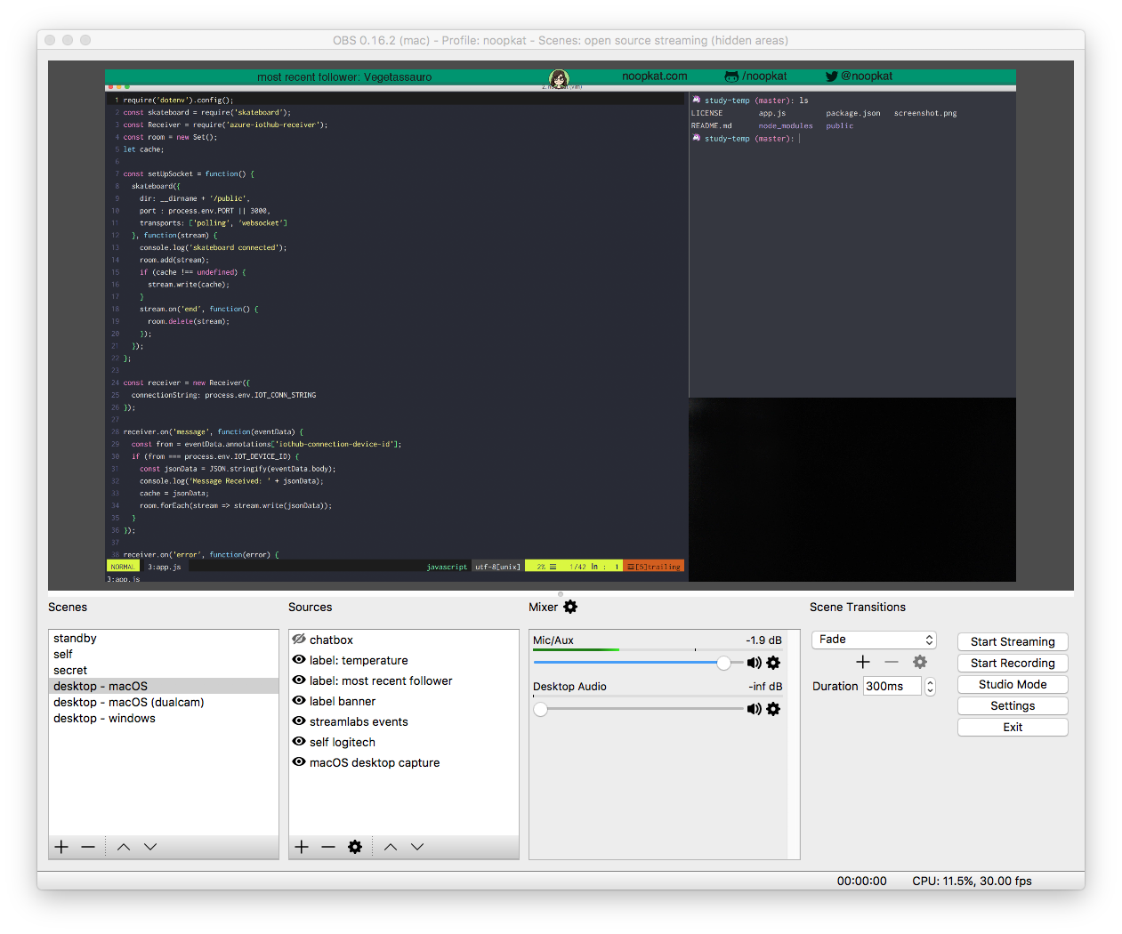 有很多免费的直播软件。我用的是 Open Broadcaster Software (OBS) 。它适用于大多数的平台。我觉得它十分直观且易于入门,但掌握其他的进阶功能则需要一段时间的学习。学好它你会获得很多好处!这是今天我直播时 OBS 的桌面截图: