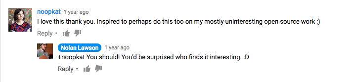 我的朋友 Nolan Lawson 让我 真正开始做 这件事,而不只是单纯地 想要做 。我看了他 在周末直播开源工作 ,做得棒极了。他解释了他当时做的每一件事。是的,每一件事,包括回复 GitHub 上的 问题issues ,鉴别 bug ,在 分支branches 中调试程序,你知道的。这令我着迷,因为 Nolan 使他的开源库得到了广泛的使用。他的开源生活和我的完全不一样。