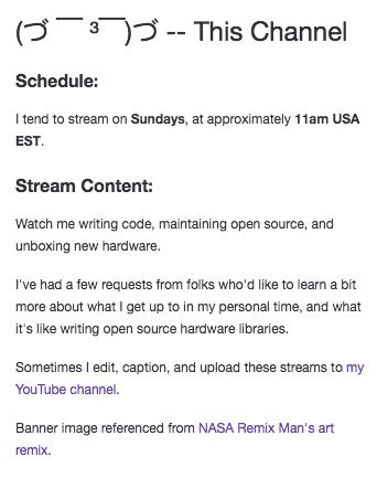 去年 7 月我进行了第一次直播。不像大多数人那样在 Twitch 上进行游戏直播,我想直播的内容是我利用个人时间进行的开源工作。我对 NodeJS 硬件库有一定的研究(其中大部分是靠我自学的)。考虑到我已经在 Twitch 上有了一个直播间,为什么不再建一个更小更专业的直播间,比如 由 JavaScript 驱动的硬件JavaScript powered hardware ;) 我注册了 我自己的频道 ,从那以后我就开始定期直播。