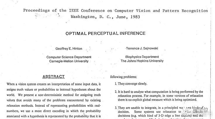 他们还给我看了另一篇论文,当时还是预印版本,题目是:Optimal Perceptual Inference,这是第一篇关于玻尔兹曼机(BM)的论文,作者是Geoffrey Hinton和Terrence Sejnowski。