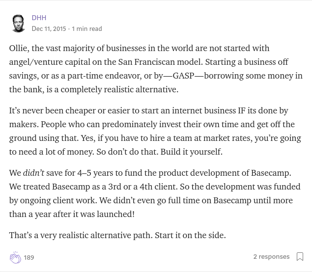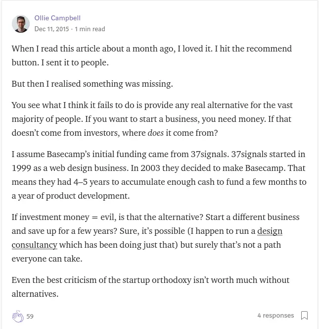 在Medium上,名为Ollie Campbell的网友就提出这样的疑问:Basecamp的模式并不是每个人都可以模仿的。
