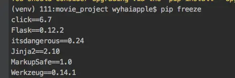 在Terminal 中输入pip freeze发现什么都没输出,证明还没有安装Flask,然后在preferences中选择如下图,我这个是添加了Flask之后才显现,如果没有点击"+",搜索Flask,然后点击Install Package即可,安装完成后,在 在Terminal 输入 pip freeze,然后很多东西输出来并且对于相应的版本