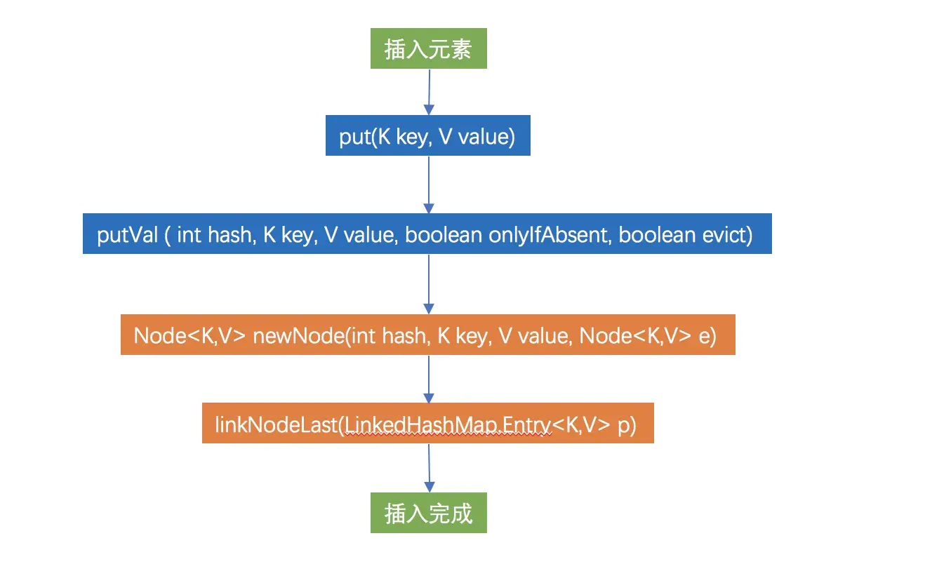 LinkedHashMap 链表创建步骤,可用上图几个步骤来描述,蓝色部分是 HashMap 的方法,而橙色部分为 LinkedHashMap 独有的方法。