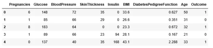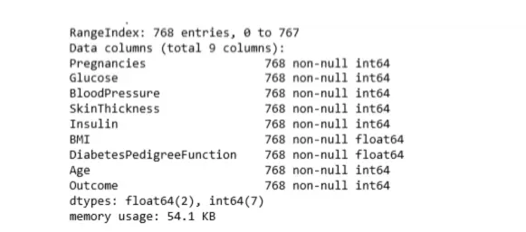 Index([‘Pregnancies’, ‘Glucose’, ‘BloodPressure’, ‘SkinThickness’, ‘Insulin’, ‘BMI’, ‘DiabetesPedigreeFunction’, ‘Age’, ‘Outcome’], dtype=’object’)